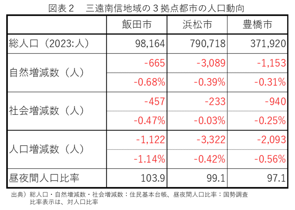 人口は浜松市79.1万人、豊橋市37.2万人、飯田市9.8万人であるから、規模には大きな違いが存在する。但し、いずれの都市も「自然減+社会減」で人口減少が進行している点では共通している。自然減が社会減よりも大きい状況である事も共通で、少子高齢化が進行している事が伺える。