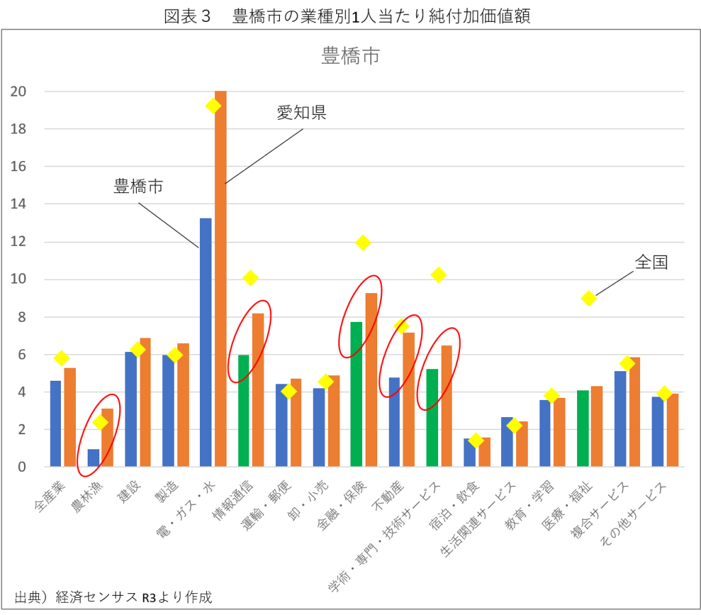 図表3は、業種別の1人当たり純付加価値額について、豊橋市、愛知県、全国の数値をグラフ化したものだ(電・ガス・水道の値が突出しているが、特殊な業種であるため着眼から外す)。総じて豊橋市は全国値(図中の黄色菱形)よりも低くなっているが、これは東京都等の大都市による引き上げ効果が大きい事によるから、主として愛知県平均値(図中の橙棒グラフ)と豊橋市(図中の青棒グラフ)を比較してみたい。