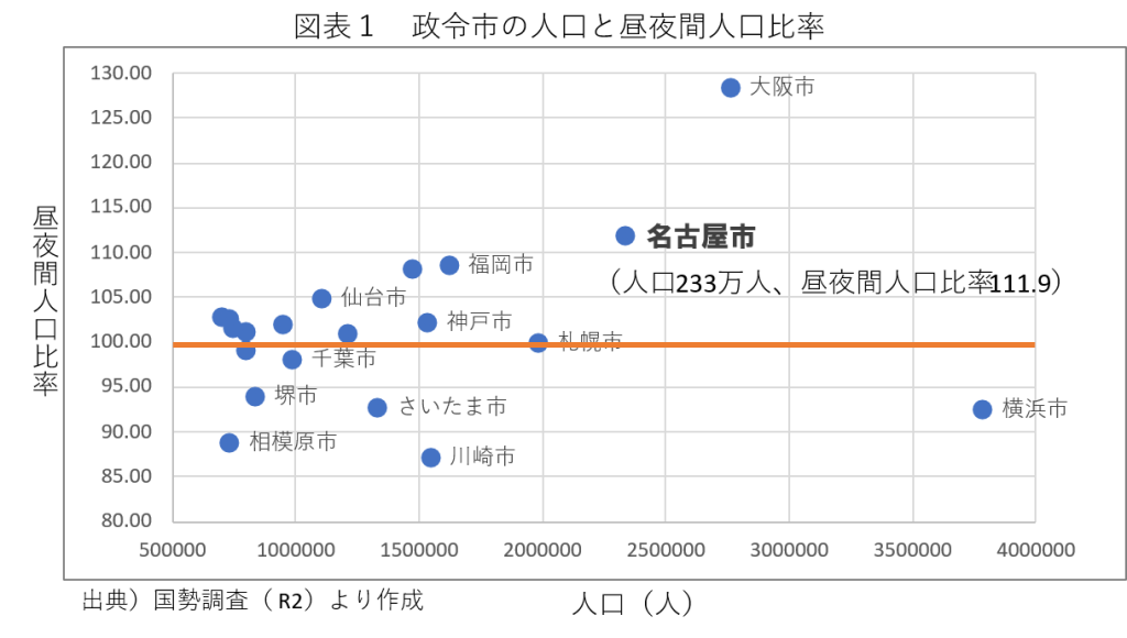都市の拠点性を知る代表的指標として昼夜間人口比率がある。昼間人口とは、市内に残留する人口に昼間の流出人口と流入人口を差し引きする事によって算出され、昼間の流入超過人口が多いと昼夜間人口比率が高くなり、通勤・通学目的の人々を吸引する拠点性が高い都市と表現できる。逆に流出人口が多い都市は、他の都市への依存性が高いため衛生的な都市と表現できる。名古屋市の昼夜間人口比率と昼間人口の特性を紐解いた。