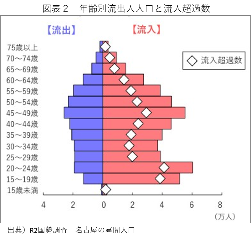 昼夜間人口比率の高い名古屋市について、昼間人口の特性を見ておきたい。図表2は、年齢別の昼間流出人口と昼間流入人口を示している。これによると、昼間流入が最も大きいのは20~24歳で、次いで45~49歳となっている。20代前半の昼間流入は、社会人と学生の両面が含まれるから流入超過数も最大となっている。他方、40代後半の昼間流入は社会人であり、この年齢層が通勤目的流入の中心と分かる。但し、30代の流入が相対的に少ないから、今後は昼間流入が減少する可能性がある事に留意しておく必要がある。