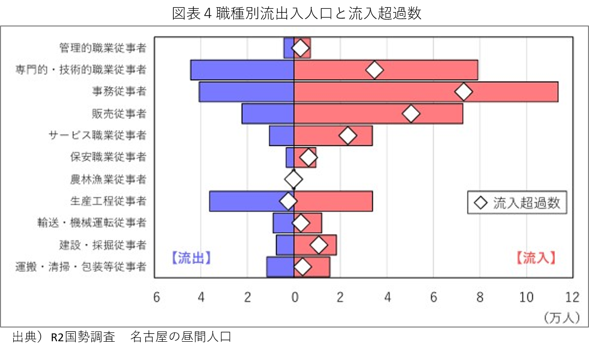 次に、職種別に昼間人口の流出入を見たものが図表4だ。これによると、最も多い職種は事務従事者で、次いで専門的・技術的職業従事者、販売従事者の順となっており、流入超過数でもこれらの3職種が上位となっている。これらの3職種は、オフィスワーカーと置き換える事が可能であるから、名古屋市への昼間流入はオフィスワーカーが中核層となっていると捉える事ができる。なお、生産工程従事者は流出入量がほぼイーブンである。