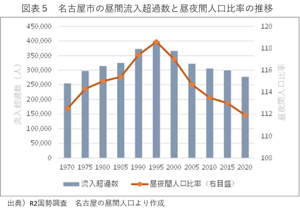 ここで、名古屋市の昼間流入超過数と昼夜間人口比率の推移を図表5で見ておきたい。これによると、名古屋市では1995年をピークに昼間流入超過数が減少に転じたとともに昼夜間人口比率も低下している事が分かる。名古屋市の拠点性に係る問題であるから、この動向を踏まえた今後の方向性を考えねばならない。