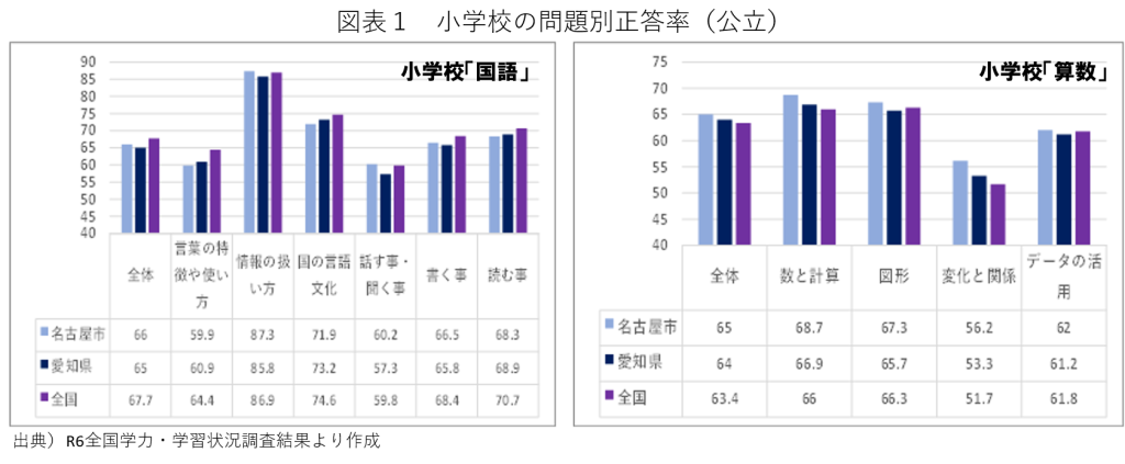 図表1は、小学校のR6年度の国語と算数に関する問題別正答率だが、国語(左側グラフ)では「全体」の項目で愛知県も名古屋市も全国平均を下回った。項目別では「言葉の特徴や使い方」、「日本国の言語文化」、「書く事」、「読む事」で、愛知県・名古屋市ともに全国平均を下回っている。