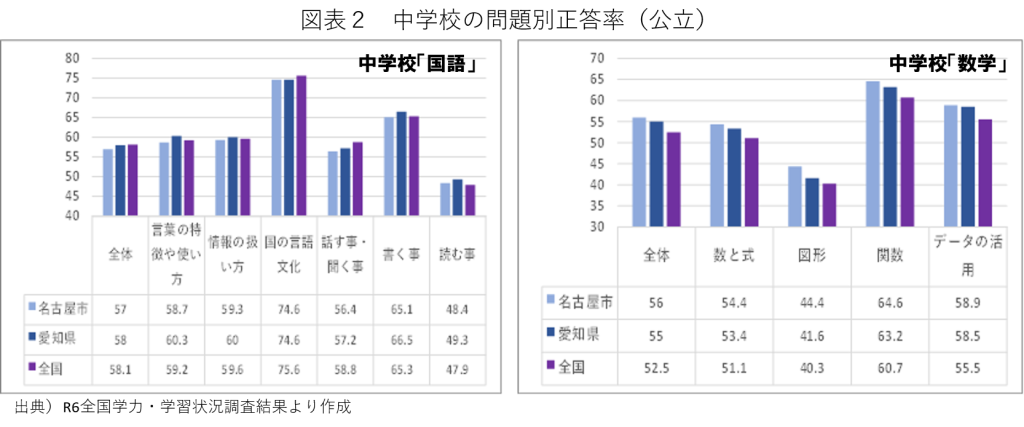 次に図表2は、中学校のR6年度の国語と数学に関する問題別正答率だが、ここでも国語(左側グラフ)では全国平均を下回っている。「全体」の項目で見ると、名古屋市が愛知県平均を下回っている点が気になる。