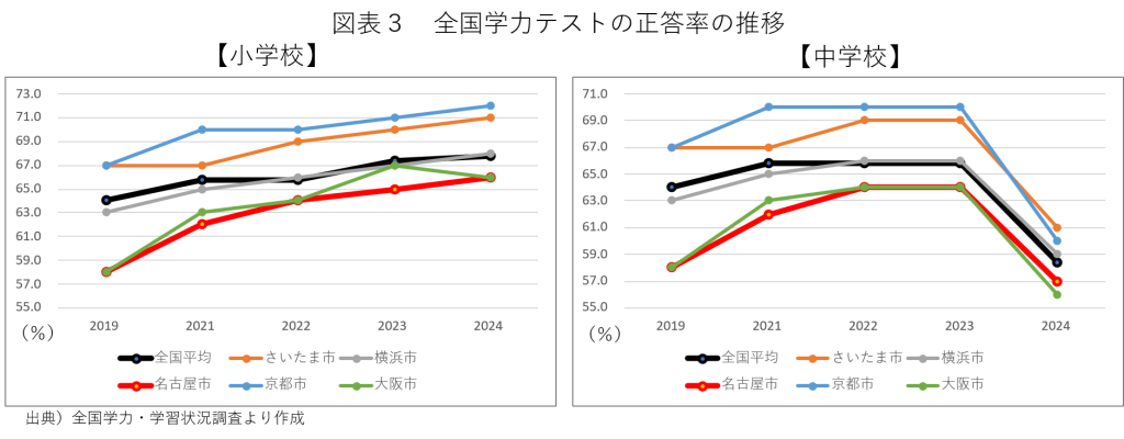 図表3は、R6(2024)年度までの過去5か年の正答率(全科目)の推移を主要な政令市についてまとめたものだ(vol.222より再掲)。驚く事に、名古屋市は小学校、中学校共に全期間で全国平均を下回るとともに、全政令市の中で最下位を大阪市と争っている。逆に、京都市とさいたま市が常にトップを争っており、順位の傾向が固定化しているように映る。「いくら何でも最下位とは」と衝撃を禁じ得ない。