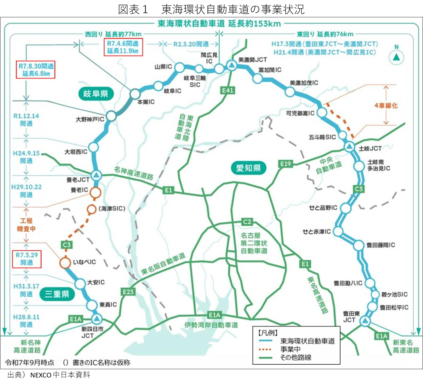 2025年度に入り、西回りのいなべIC~大安IC、山県IC~本巣IC、本巣IC~大野神戸IC間が相次いで開通し、全線153kmのうち9割までが繋がった(図表1)。残すは、養老IC~いなべIC間のみとなったが、養老トンネルが想定以上の難工事となって進捗を拒んでいる。全通まで安全に工事を進めて頂くよう、関係する土木技術者に忠心からエールを送りたい。