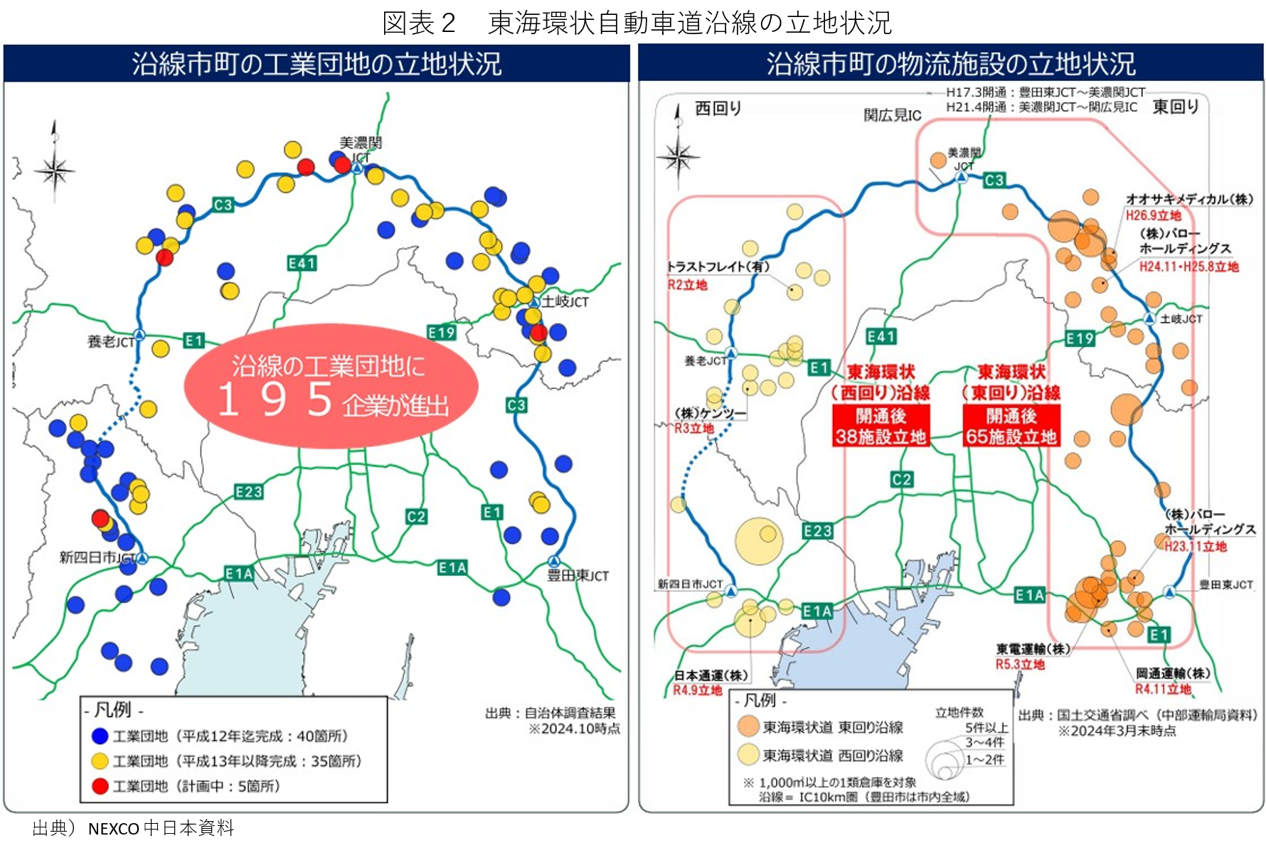 東海環状自動車道の整備に伴って沿線地域が享受したメリットの代表格は、企業立地の進展だ。図表2はNEXCO中日本が作成した立地実績だが、工場立地は195社、物流施設では103社が立地したと分かる。沿線地域の全ての地域で人口減少が進行しているから、個人市民税は停滞から減少へと推移する情勢だが、企業立地が進めば固定資産税が増収となり、雇用が生まれ、観光消費も活性化するなど、地域経済に多大な影響をもたらしていると捉えて良いだろう。