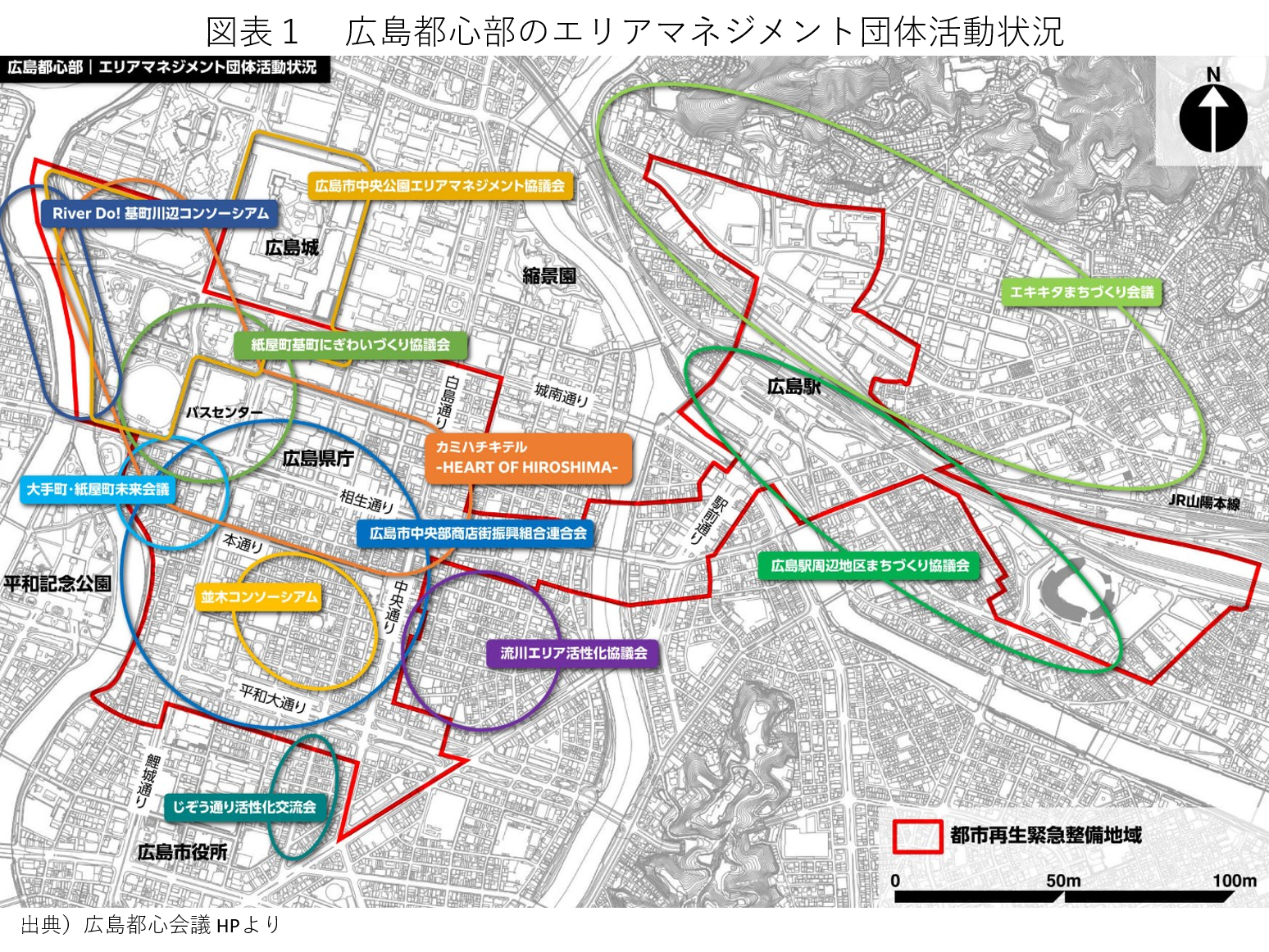 他方、広島市の都心部には数多くのエリアマネジメント団体が設立されているが(図表1)、相互連携が密に取れているとは言い難く、広島都心活性化プランとの嚙み合わせもしっくりいっていなかったようだ。これが、第二の危機感となった模様で、都心のエリアマネジメント団体が協働して都心活性化に貢献する動きを作りたいとの思いが有志の中に燻った。