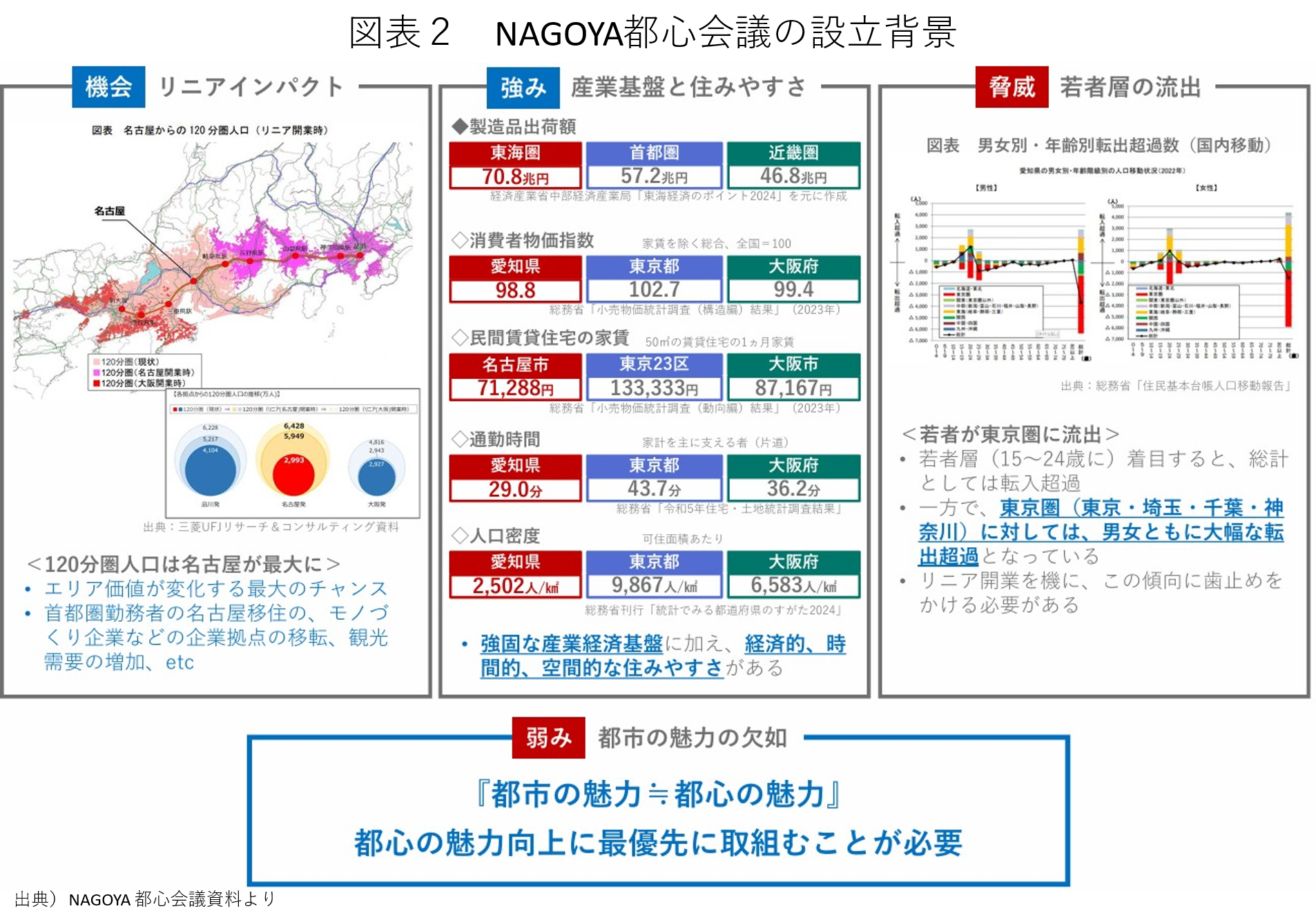 NAGOYA都心会議が作成した資料から、その概要をご紹介したい。まずは、設立の背景だが(図表2)、今後の国土においてリニア中央新幹線のインパクトを強く享受できる「機会」があり、モノづくり産業集積と共に歩んできた発展経緯と大都市でありながらゆとりがあるという「強み」を持っているものの、若者の東京圏への流出超過が止まらないという「脅威」がある事から、都市の魅力が欠如しているという「弱み」を克服する必要があると建付け、都心の魅力づくりを行う必要があるとしている。