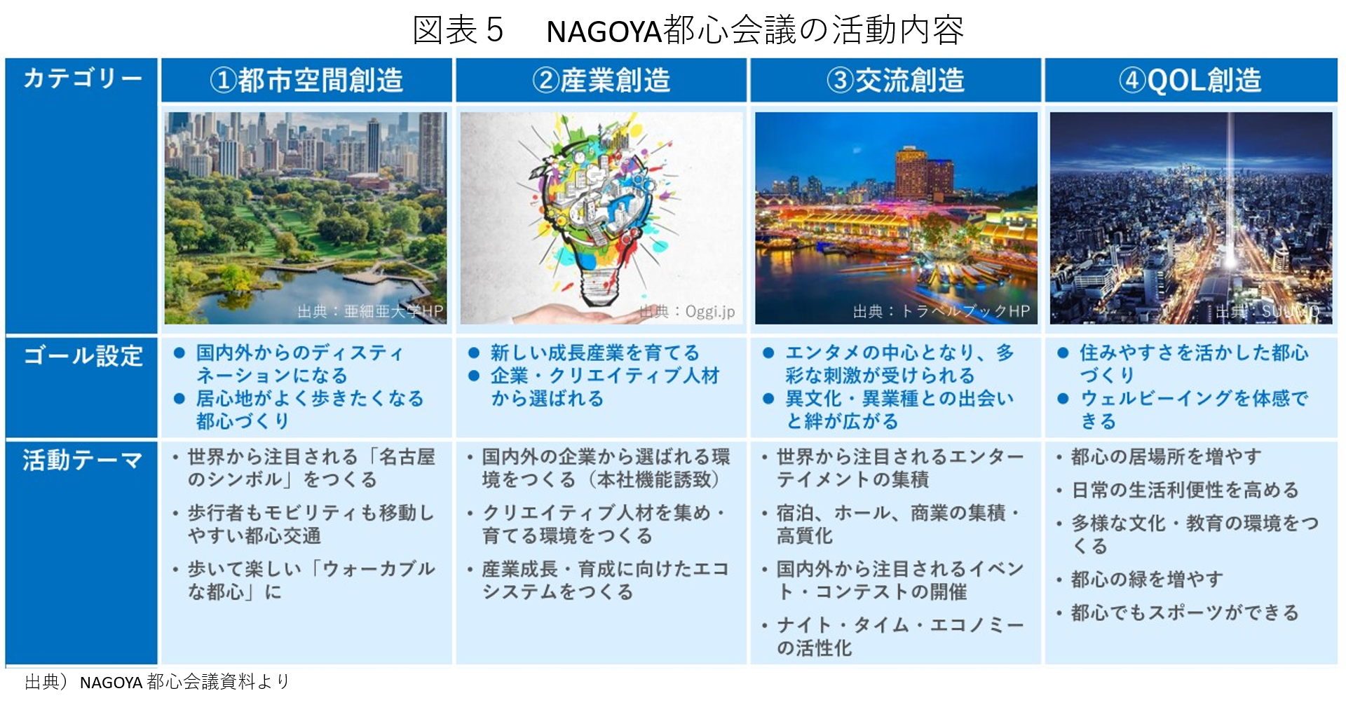 活動内容としては①都市空間創造、②産業創造、③交流創造、④QOL創造の4本柱が設定された(図表5)。機能と基盤で構成される都市空間を再構築し、クリエイティブ人材が集う産業を育て、昼も夜もエンタメの中心となり、市民のQOL向上に貢献する都心とするための検討を行うと読める。都心の果たすべき役割を議論する上では、いずれも重要かつ適切なテーマ設定で、当面は①~③に部会が設置されて議論が始まる。
