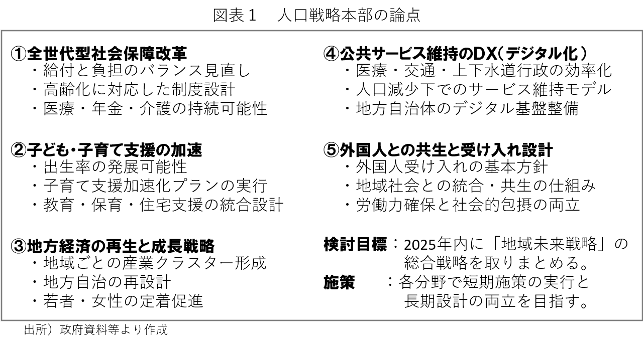 人口戦略本部は、立ち上げ早々に論点と対策の柱立てを構築し、検討に着手している。ここまでは極めてスピーディで高市首相のリーダーシップが発揮されていると映る。論点は5つの柱で整理されており、各々の柱に検討や対策の課題が整理された(図表1)。
