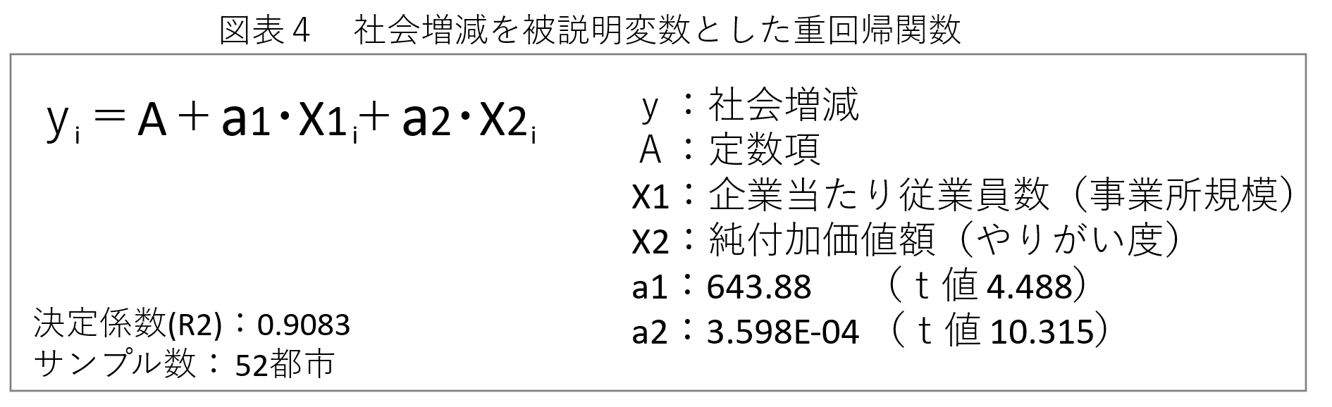 図表4は、全国の政令指定都市と県庁所在都市をサンプルとして構築した社会増減を被説明変数(左辺)とする重回帰関数だ(R2;0.9083)。説明変数(右辺)は企業当たり従業員数と純付加価値額で、これらを増進させれば社会増加が進むという関係を示唆している。本社機能を増やせば事業所規模は大きくなり純付加価値額も高まるし、1人当たり付加価値額の高い業種(情報通信業、金融・保険業、学術・専門技術サービス業、医療・福祉業等)を増やす事でも純付加価値額が高まるから、こうした産業機能・業種を首都圏から移転させる事が受け入れた都市の社会増を増進させる事となる。特に、これらの機能・業種の移転は若者(20~30代)や中堅層(30~40代)を吸引する事に繋がる点が重要なポイントだ。