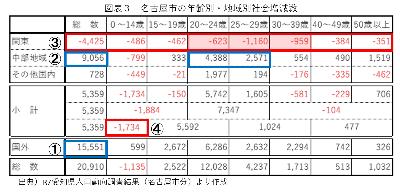 名古屋市における社会増の構造を紐解くため、社会増減の年齢別・地域別の内訳(R7年)を集計したものが図表2だ。この中に名古屋市で構造化している人口問題が潜んでいる。図表2の①にあるように、社会増減の中で最も大きなボリュームとなっているのは国外からの増加(15,551人)だ。日本人の帰国等も含まれるが、主として外国人の転入によるものだ。また、国内の人口移動においても図表2の②にあるように中部地域から9,056人の社会増があり、主として20~29歳でボリュームが大きい。こうした外国や中部地域からの人口吸引力が、名古屋市の人口問題を楽観視する風潮に繋がっていないだろうか。