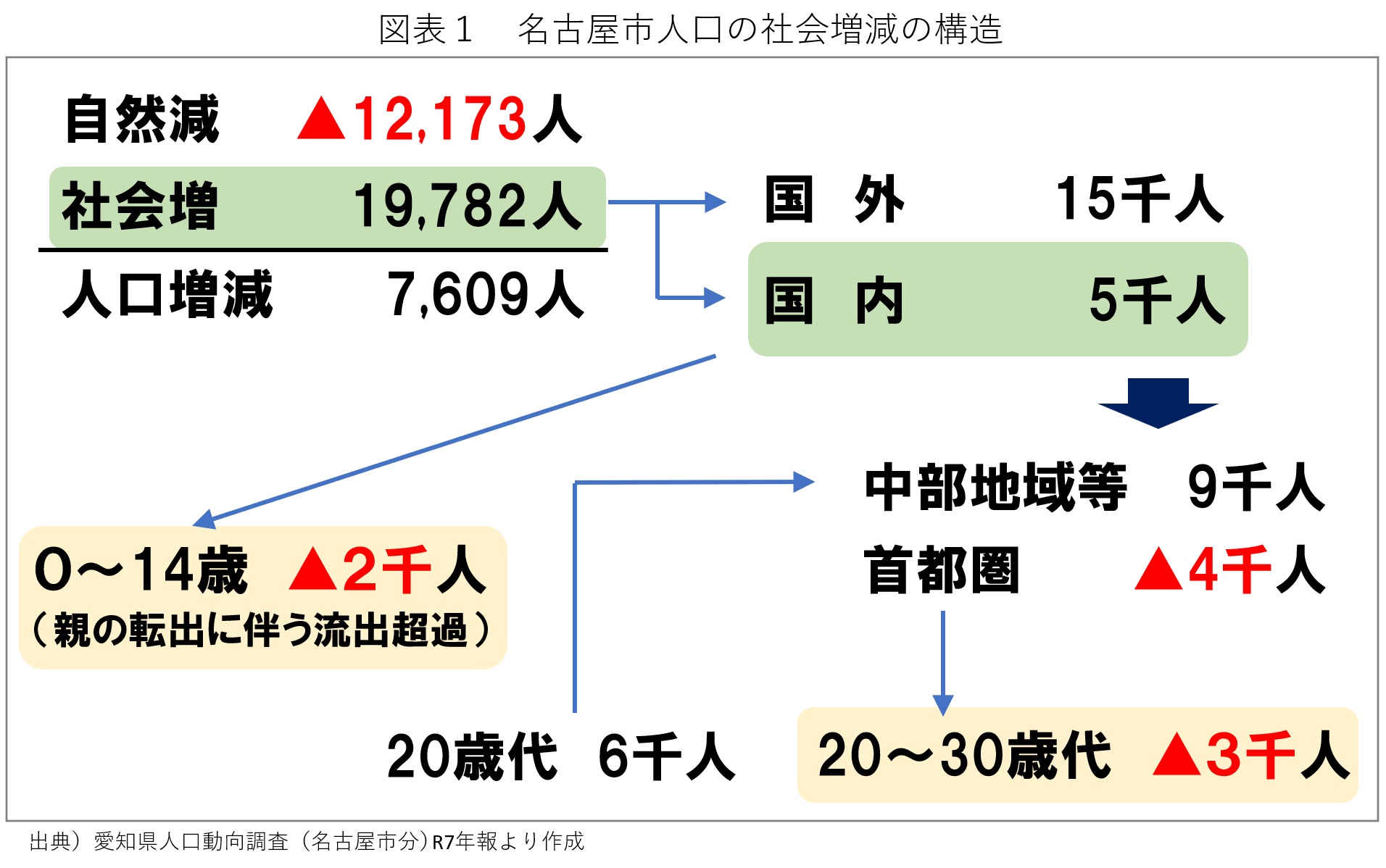 名古屋市の人口は233万人台で微増を維持しているが、その構造を紐解くと、加速する自然減を社会増で補っている構図だ(図表1:R7人口増7,609人)。但し、社会増の内、国外からが15千人で国内からは5千人であるから、その太宗を占めるのは外国人の転入によるものと分かる。日本人に限れば、自然減を社会増で補う事は出来ておらず減少している。そして、国内からの社会増5千人の内訳は、中部地域から9千人の転入超過がある一方で、首都圏に▲4千人の転出超過があり、その中心は20~30歳代の若者だ。また、0~14歳に限れば▲2千人の転出超過であり、これは子育て層の近隣市への転出によるものだ。