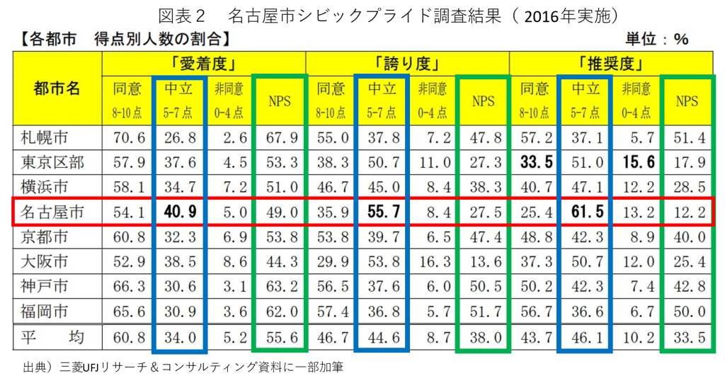 一方、2016年に実施されたシビックプライド調査では、名古屋市のシビックプライドが主要都市の中で最低と報じられた。この時に論拠となったのが図表2の資料である。愛着度、誇り度、推奨度について各都市の市民に同意か非同意かを問うた結果を集計したものだ。新聞紙上で取り上げられた数値は図表内のNPS(ネットプロモータースコア:緑の枠線、[NPS=同意―非同意])で、確かに名古屋市の数値はいずれもほぼ最下位だ。しかし、筆者が着目したいのはそこではない。名古屋市の「非同意」の数値は他市よりも低いから、名古屋市民は不満を持っていないと分かる。その一方で「同意」も総じて低いためにNPSが低く算出されており、中立のスコアが他市よりも高い。つまり、名古屋市民は「不満を持っていないが、決定的な自慢も持っていない」と解する方が実態を表しているはずだ。