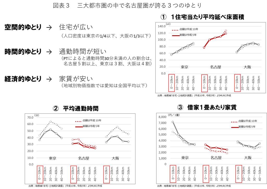 名古屋市の最大のウリは、「3つのゆとり」にあると筆者は常々発信して来た。三大都市圏で比較すると住宅が広く、通勤時間が短く、家賃が安い事が明らかだ(図表3)。即ち、大都市圏でありながら空間的・時間的・経済的なゆとりが最もあるのが名古屋圏であり、これが誰もが実感する暮らしやすさに直結している。先に見た図表2で非同意が低いのも、この点に起因しているだろう。にもかかわらず、若者は首都圏に大量に流出を続けている。若者たちが暮らしやすさ以上に求めているものが東京にはあり、名古屋にはないという事になる。これを突き止めなければ流出を止める事はできまい。また、子育て層が近隣市に流出する理由も同様に突き止める必要がある。