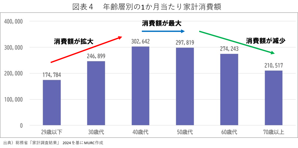 名古屋市が抱える若者と子育て層の流出現象はなぜ看過できない問題なのか。それは、将来の名古屋経済を縮退させるからだ。図表4は、年齢層別の1か月当たりの家計消費額を示している。20歳代から40歳代にかけて家計消費額は上昇し、40~50歳代で最大となり、60歳代以降で減退していく実態が明確に出ている。つまり、若者は消費拡大を先導する層であり、子育て層は消費のエンジンとなる層なのだ。これらの層のいずれもが流出を続ければ、名古屋市経済の未来は暗いと考えざるを得ない。家計消費が消失すれば市内総生産は減退する。これを手っ取り早く補えるのは観光消費だが、これも名古屋市は得意分野とは言えない。