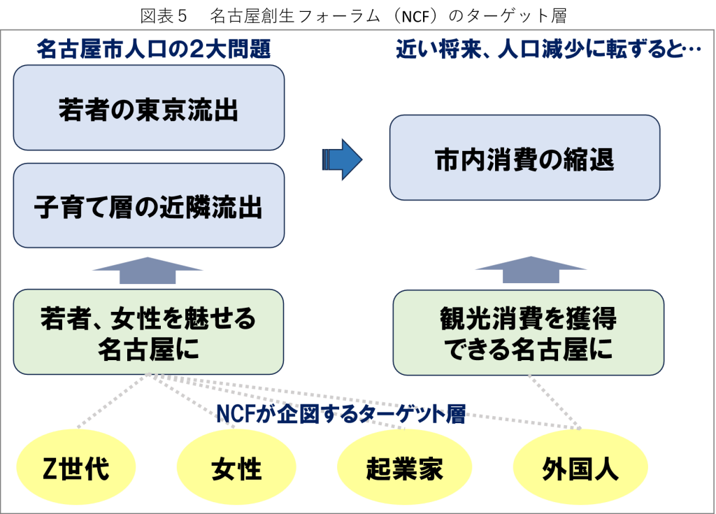 こうした事を踏まえると、今後の名古屋市のまちづくりには、若者や子育て層(特に女性)を魅せる都市になる必要があり、早晩訪れる人口減少期に向けては観光消費を獲得できる都市を目指す必要がある。こうした課題認識のもとに政策を展開する事が、名古屋市に求められている都市経営と考えて良いはずだ。そこで、名古屋創生フォーラムでは、Z世代、女性、起業家、外国人をターゲット層として選ばれる条件整備を議論したいと考えている(図表5)。名古屋市が抱える固有の課題に正対し、克服の道を探る事が名古屋創生フォーラムの設立趣意である。