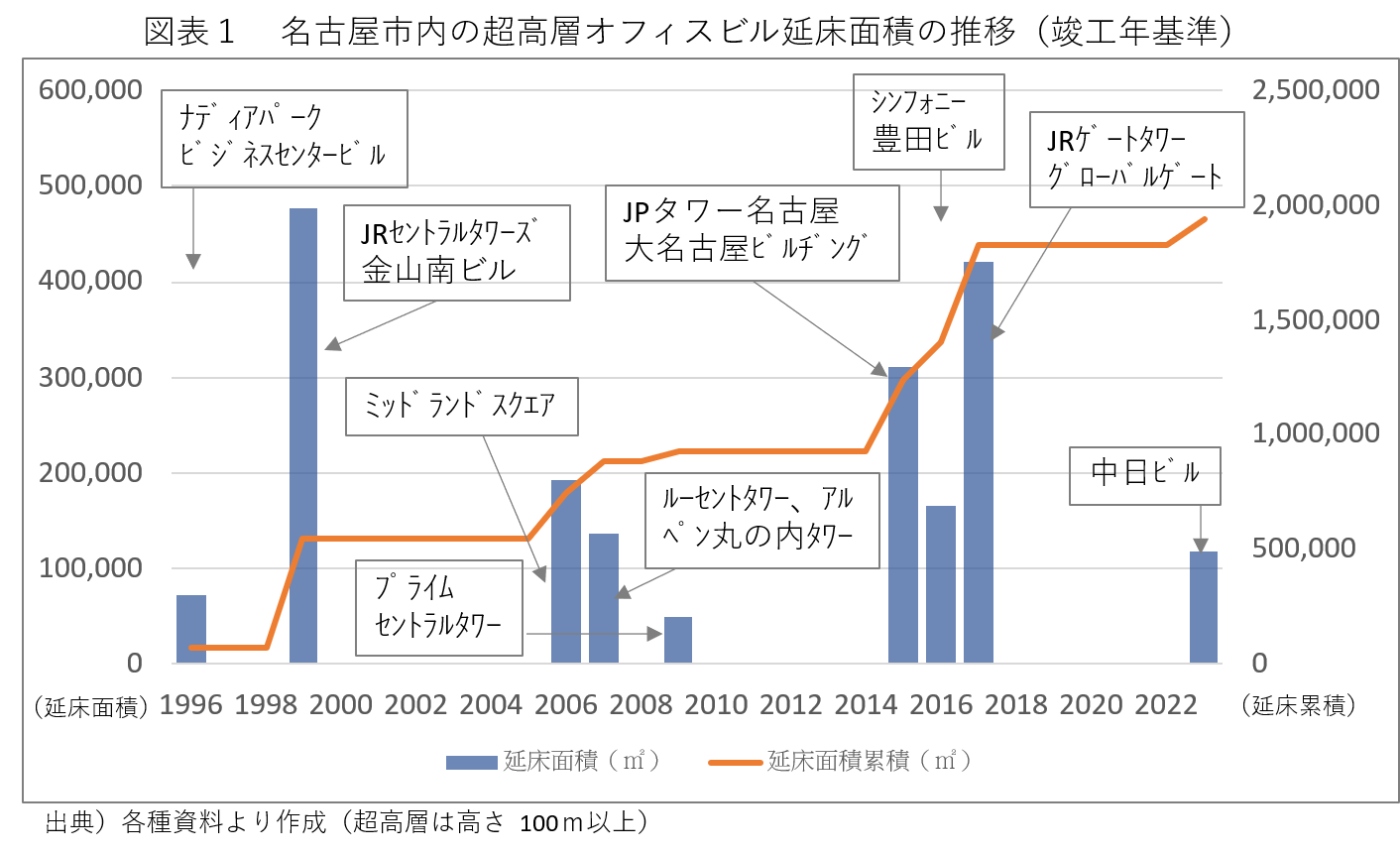 超高層オフィスビルが供給する床面積は1棟あたり10万㎡を超える大規模となり、図表1(橙折れ線グラフ)に示すように、超高層だけで累積200万㎡に近いオフィス床が供給されてきた事となる。これは、名古屋市都心部における業務機能集積が高度化してきた歴史として捉えたいのだが、実態はどうだろうか。