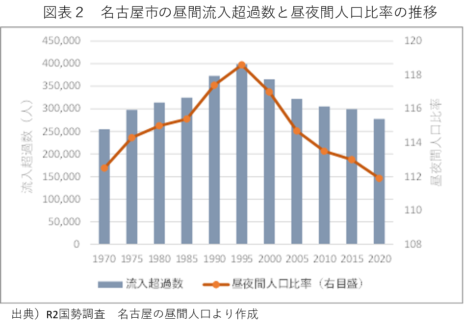 2.名古屋の昼間人口の推移  -超高層化の一方で昼夜間人口比率は低下-