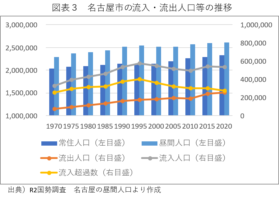 もう少し詳しく見るために、名古屋市の常住人口、流入人口、流出人口、昼間人口の推移を総括的に見たものが図表3だ。棒グラフを見ると、常に昼間人口は常住人口を上回って推移しているから、名古屋市の昼夜間人口比率が100を超えている根拠を示している。次に、折れ線グラフを見ると、一貫して流入人口(灰線)が流出人口(橙線)を上回っているから、昼間の流入超過で推移しているという事も分かる。但し、流入超過数(黄線)は1995年をピークに低下傾向だ。
