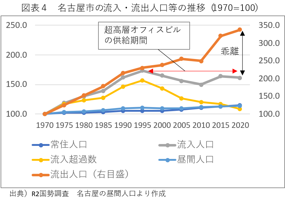 増減傾向の強弱を明確化するために、図表3のデータを1970年を100とした指数に置き換えたものが図表4だ。これを見ると、1995年以降に流出人口(橙線)の伸びが急伸した一方で、流入人口(灰線)が減少から停滞傾向へと推移している。これによって流入超過数(黄線)が減少傾向へと転換したと分かる。つまり、1995年以降の名古屋市では、流出人口の増加率が流入人口の増加率を上回って推移し、両者が乖離したため、超高層オフィスビルが供給された期間においても昼間の流入超過人口が抑制されて昼夜間人口比率の低下につながったと解される。