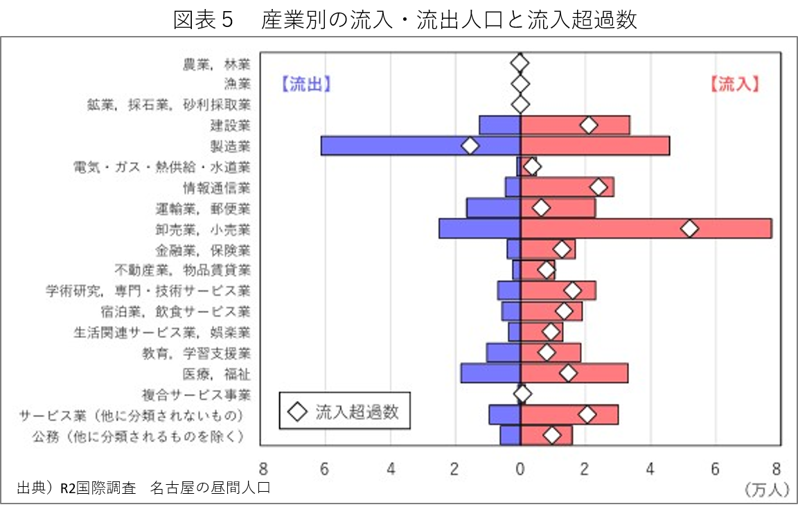 次に、流出人口の増加の実態を把握しておきたい。図表5は、産業業種別の流入・流出状況と流入超過数(◇印)を見たものだ。これによると、流出人口が最も多く流出超過となっているのは製造業と分かる。つまり、名古屋市に居住して西三河地域等に立地するモノづくり企業に従事する人々が多いという事だ。尚、流入人口が最も多く流入超過となっているのは卸売・小売業であるから、名古屋市の基幹産業が卸売・小売業であると確認できる。この様に、1995年以降に流出人口の増加率が上昇した背景には、「名古屋居住・製造業従事」というパターンが増えたと解しておく必要がある。即ち、名古屋市は拠点性の高い都市で昼間人口を周辺地域から吸引しているが、同時に周辺地域の製造業集積に人口集積が支えられている側面もあるという事であり、相互依存の関係が存在しているという事だ。